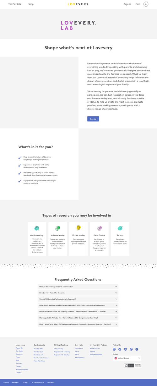 The Product Innovation team at Lovevery entrusted me with creating a sign-up page for their research testing community. I led the design process from concept to execution, starting with wireframes and mockups to define the layout and functionality. I then designed the page to seamlessly guide users through the sign-up process, incorporating a clear call-to-action button linking to a sign-up form. To enhance clarity and engagement, I included explanations of the different types of testing available, as well as a dedicated FAQ section to address common questions about the research community.
